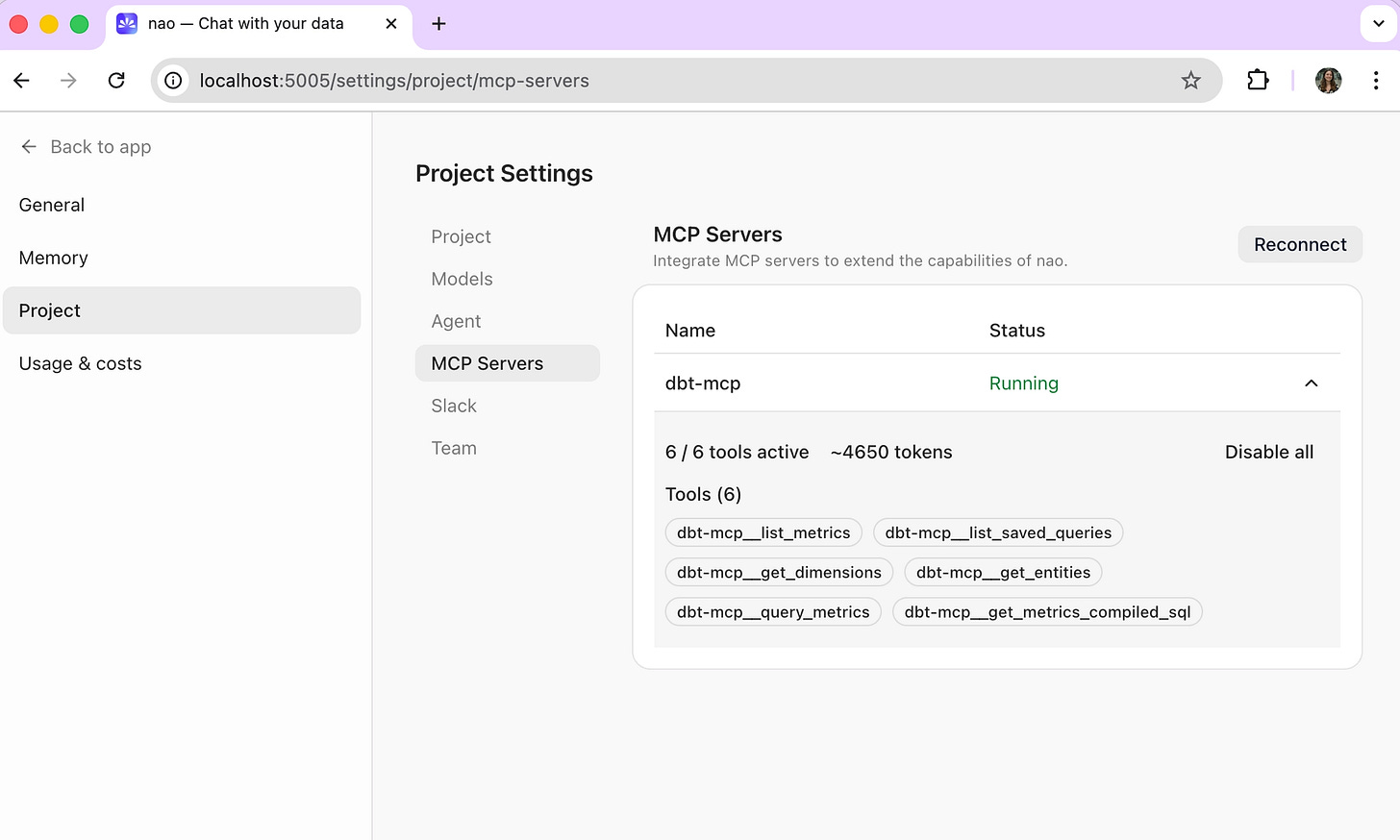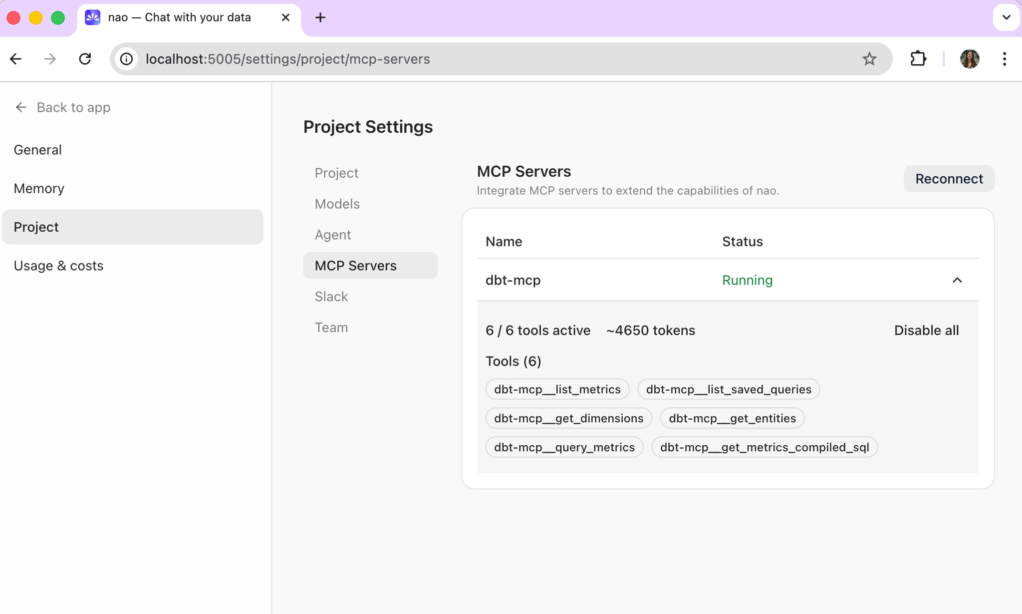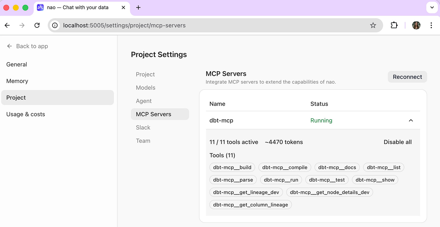 nao chatIn the admin panel under Project > MCP Server, you can verify the dbt MCP is connected and see which tools are active. This is also where you can toggle individual tools on or off.