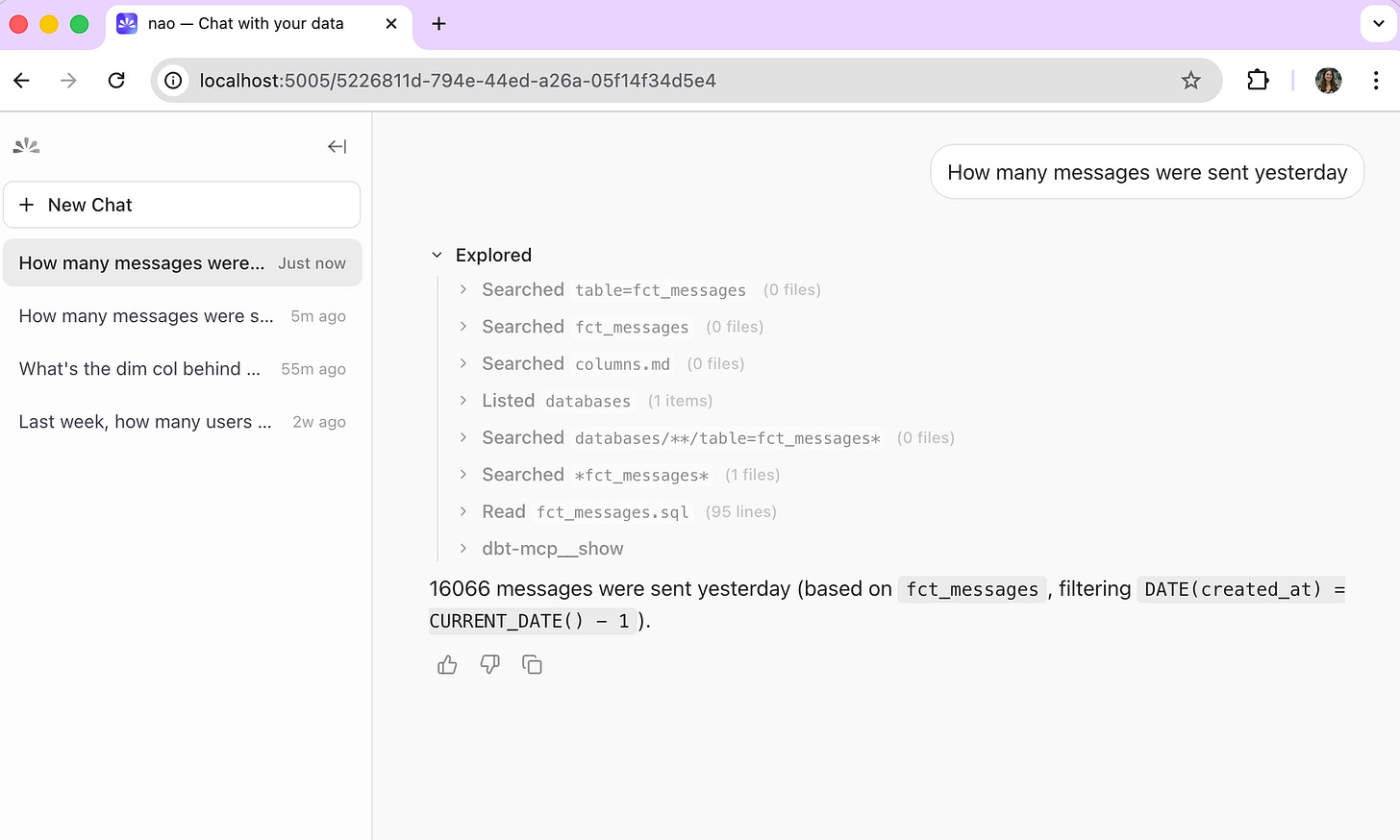 Example chat using dbt Core - agent queries data via dbt show