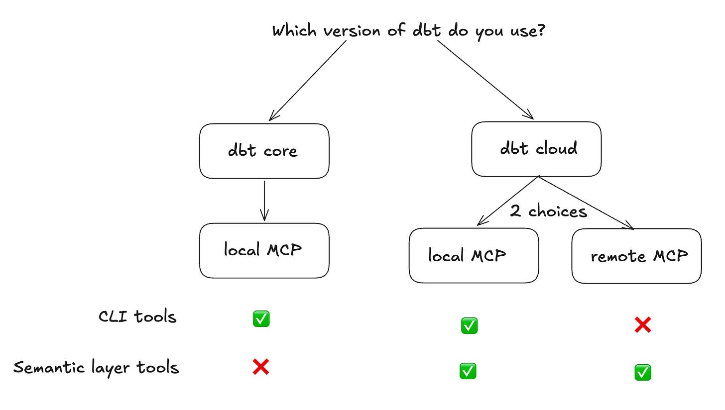 Are you on dbt Cloud and only want to query your semantic layer? → Remote MCP. The MCP server is hosted by dbt. No installation required - you point your client at a URL and pass auth headers. It gives you access to the Semantic Layer and Discovery APIs. No CLI commands, which makes it a bit more complex to use execute_sql tools and get out of the semantic layer.