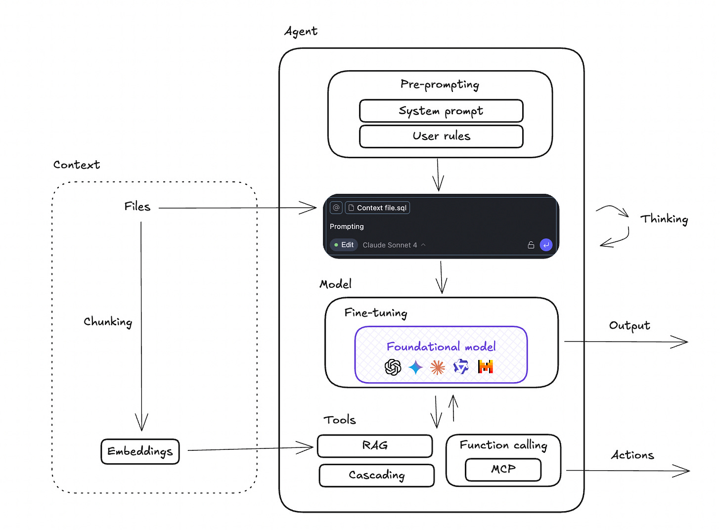 When you ask the agent “I want to modify this file”, there’s actually a lot of context and tools given to the agent to perform this task.
