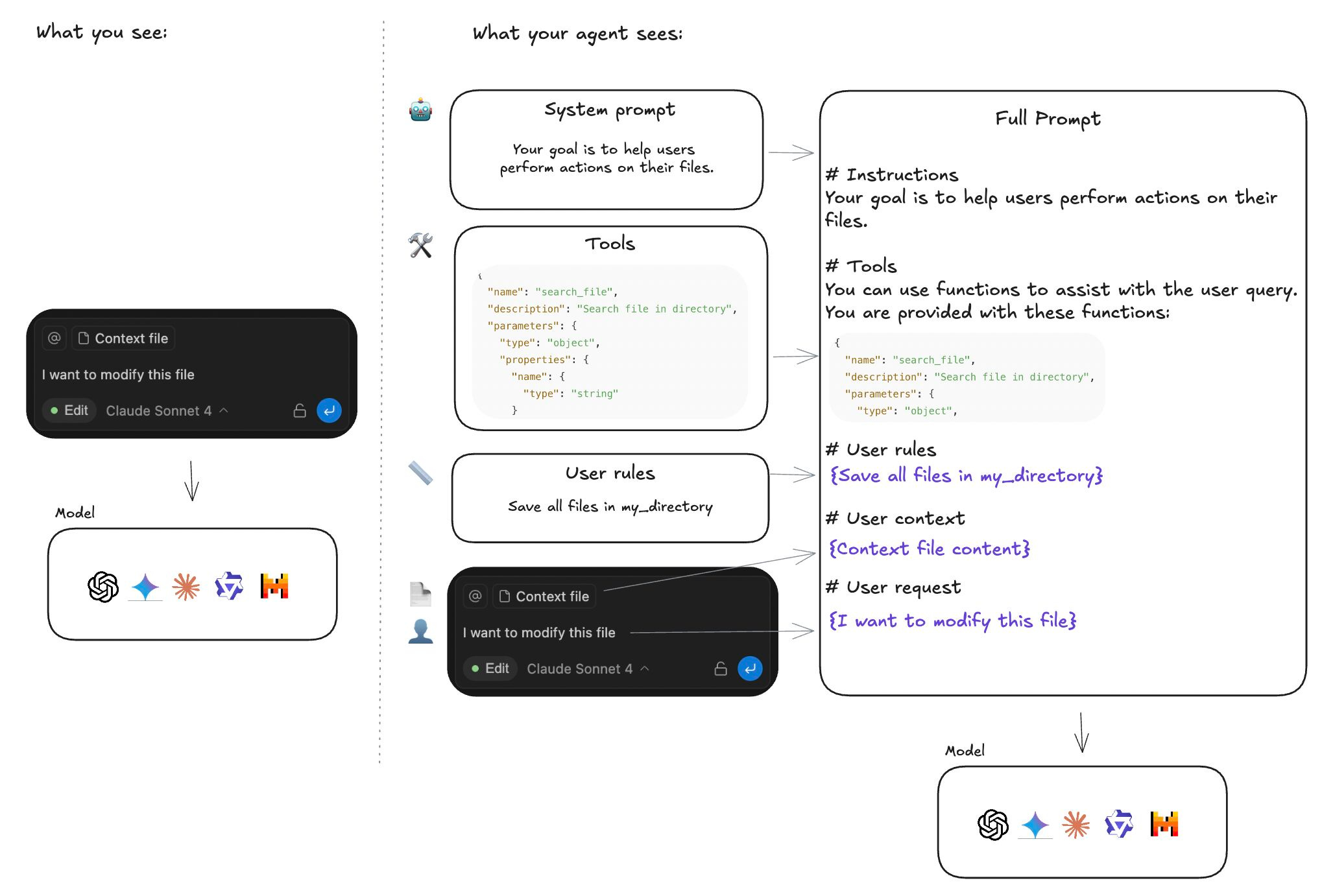 When you send your prompt, it is sent with the attached system prompt (general rules) and any user rules you’ve defined (like constraints or preferences). This sets the “personality” and specific rules of the agent.Context injection
