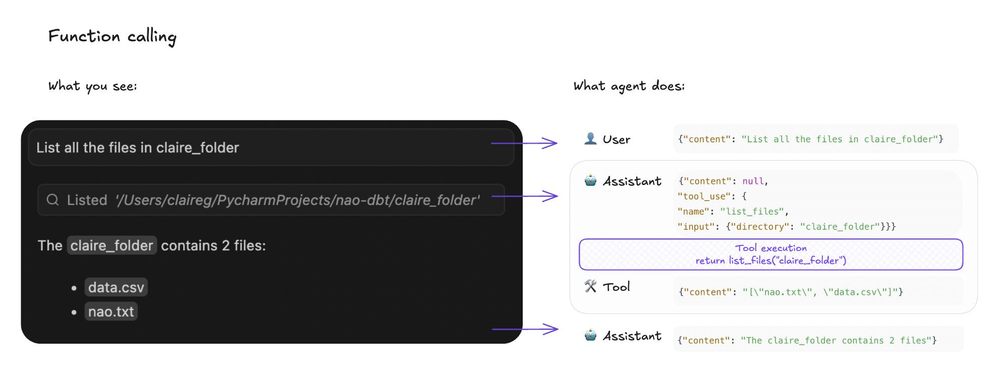 In order to perform actions - and not only write text - the agent uses function calling. It calls tools - that actually are just code functions - which can do anything: create/modify a file, send emails, etc.